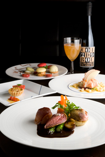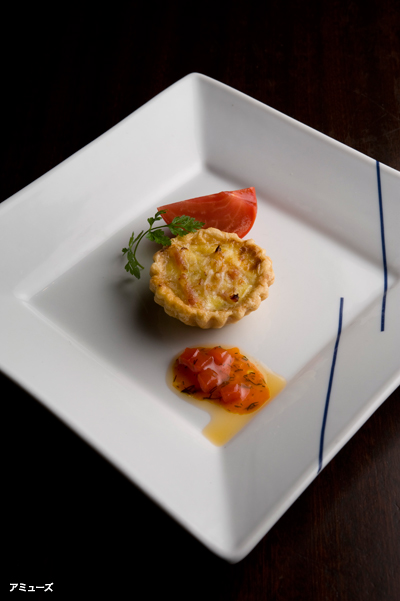 主題曲を耳にするだけで胸がせつなくなる『シェルブールの雨傘』。舞台となるシェルブールはフランスの北の地、ノルマンディー地方にあります。りんごや、それを使ったシードルにカルヴァドス、チーズやバターなどの乳製品、海産物、各種食肉等、美食の素材が豊富に産出される地、というわけで、ノルマンディーに思いを馳せた特別コースを提供致します。まずはアペリティフに、シリル・ザンクという造り手によるノンフィルターのシードルを。心地良い香りと泡を、アミューズのノルマンディー風タルトとともにお楽しみください。シードルは、ノンアルコールのジュ・ド・ポム(りんごジュース)に替えることもできます。