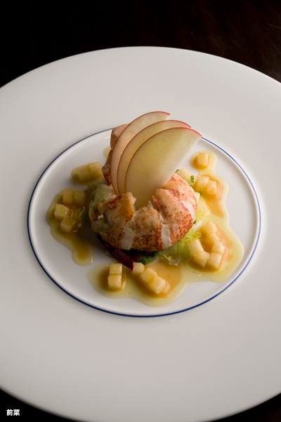 前菜は、甘酸っぱくサクサクとした食感のりんごのサラダを組み合わせたオマール海老。シードルとフォン・ド・ヴォーのソースが味の奥行きを与えています。