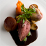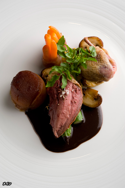 フレッシュな印象の前菜に対し、メインは妖艶な鳩のロティ ルーアン風。ルーアンはノルマンディーの地で、エトゥフェ(窒息)鴨を1羽丸ごと使用し、骨や内臓、血などすべての旨味をソースに溶け込ませた料理です。同じくエトゥフェの鳩にアレンジし、じっくり火を入れたりんごのタタンを添えました。非常に手間のかかる伝統のソースは、きっと、食通にもご満足いただけるはず。