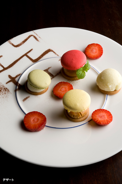そしてデザートは、色とりどりの傘を持った人々が行き交う石畳の通りを上から見た、映画の冒頭のシーンをデザイン。あの色遣いの斬新さ、50年近くも前の作品とは驚きですね。マカロンの傘の下にはカルヴァドス風味のりんごのソテーとキャラメルクリーム、青りんごのムース、そしてりんごのソルベ、とやはり最後もりんごをテーマに展開しました。
