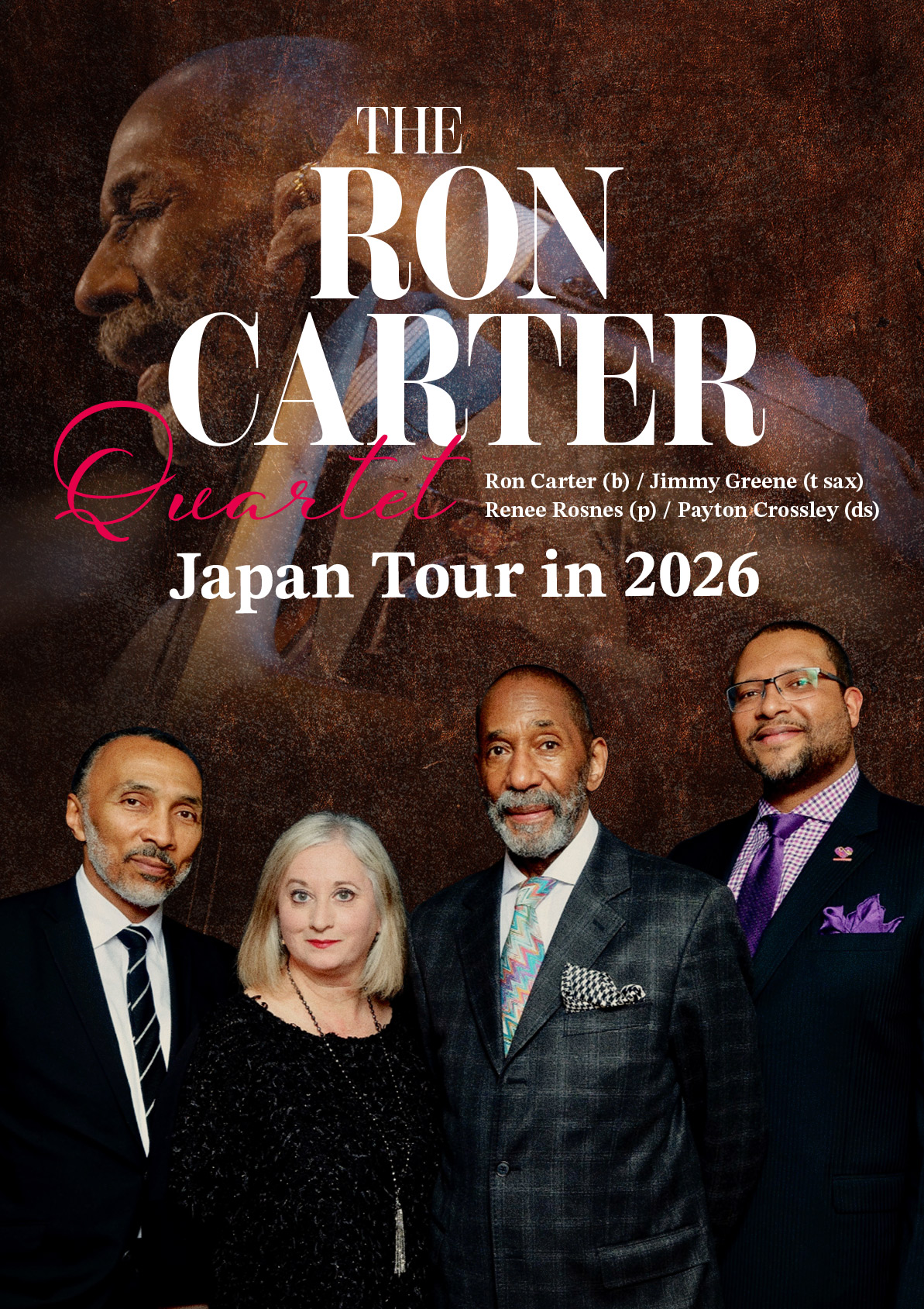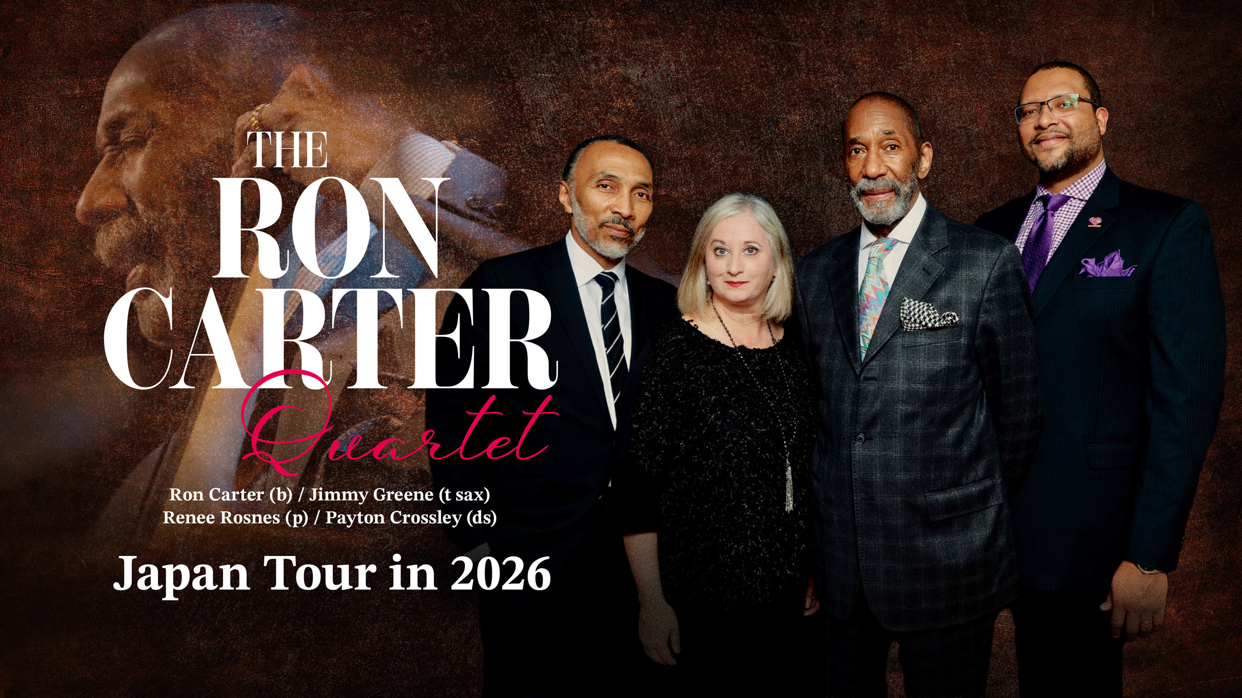 至高のプレイと格調高いサウンドで、ジャズ・ベースを象徴する巨匠ロン・カーターが待望のカルテットで登場する。1963年にマイルス・デイヴィスのバンドに加入し、『マイ・ファニー・ヴァレンタイン』など数多くの名盤に貢献。その後もジム・ホールやハービー・ハンコックのバンド、さらに自己のグループでも多彩な活動を展開。“最多レコーディング数を誇るジャズ・ベーシスト”としてギネス世界記録を保持し、2021年には日米親善に寄与したとして旭日小綬章を受章するなど、国境を越えて敬愛されている。カルテットのメンバーには、これまでもツアーやレコーディングで共演を重ねてきたリニー・ロスネス(ピアノ)、ジミー・グリーン(サックス)、ペイトン・クロスリー(ドラムス)の名手たちが参加。レジェンドを体感する極上の夜となる。