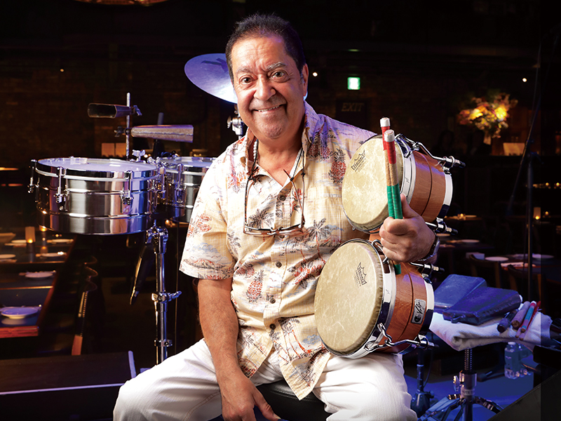 サルサ/ラテン・ジャズ界の巨匠、エディ・パルミエリ(御歳80歳!)率いるサルサ・オーケストラの一員として来日した伝説のパーカッショニスト、ニッキー・マレーロ。ボンゴ&ベルを基本に、時に小口径のティンバレスで歌心に溢れたソロを叩く。にこやかな表情そのままの"太陽のようなサウンド"はとにかくご機嫌だ。幼少の頃より音楽に溢れた家庭で育ったニッキーは、ティンバレスに憧れて叩き始め、やがてボンゴとベルを手に取る。つまり、最初に手にした楽器たちが、現在も彼のメインとなっているのだ。何と素晴らしいことか!