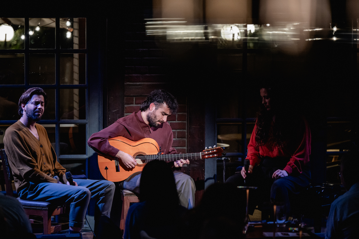 BLUE NOTE PLACEで開催された公演は、アカペラの「Recordante」から始まりました。向かい合って歌うふたりの歌声が、会場を包み込むように響きます。日本語を読みあげながらのMCに続いて、ギタリストのダリオ・バロッソが参加、3人によるパフォーマンスへと移行してゆきます。ルイーザ作「Hoje Ja Nao E Tarde」は、同じフレーズを追っかけるように歌うかと思えば、異なるメロディを同時に歌ったり、一転して実に美しいハモリを聴かせたり、シルビアとサルヴァドールの卓越した"ヴォーカル力"のショウケースといえるような楽曲。ダリオの指弾きアコースティック・ギターも冴えわたり、ラストの「Muerte Chiquita」ではバイヨンとフラメンコが共存するような曲調を、ベース・ライン/和音/オブリガートの同時演奏(といっていいでしょう)と共に届けてくれました。