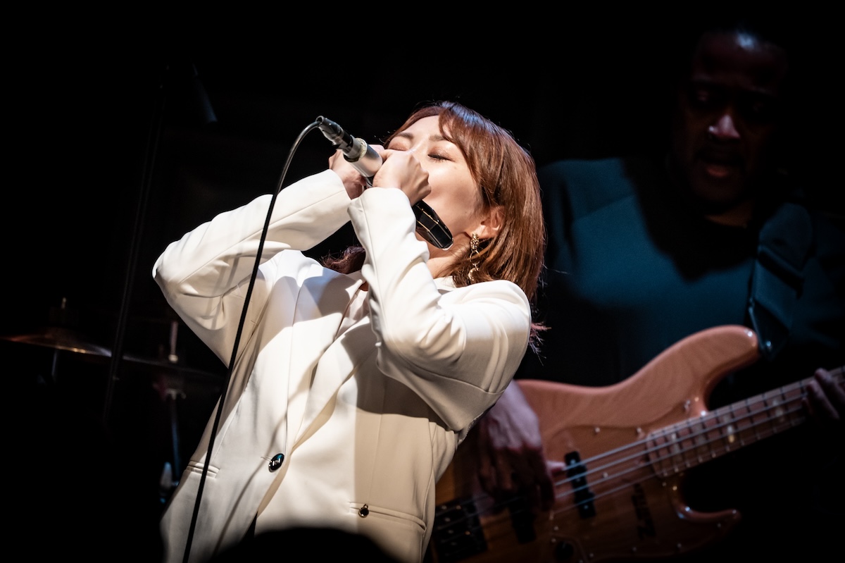 スペシャル・ゲストとして参加した、前述のレガ・ダウナは、もちろんメイン楽器であるハーモニカでも魅力を発揮。2020年のアルバム『Expansions And Visions』に提供した自作曲「Back To Wonderland」では、特に大きくフィーチャーされました。2018年の来日時はまだ少年の面影を残していましたが、いまの彼は観客の耳目をひきつけてやまない、華のある存在になったといっていいでしょう。そしてステージのラストは、場内総立ち状態のまま、伝説的トランぺッターであるトム・ブラウンが80年代初頭にヒットさせた「Funkin' For Jamaica」の新解釈へ。実に見事な流れでした。
