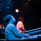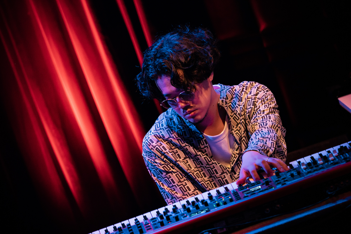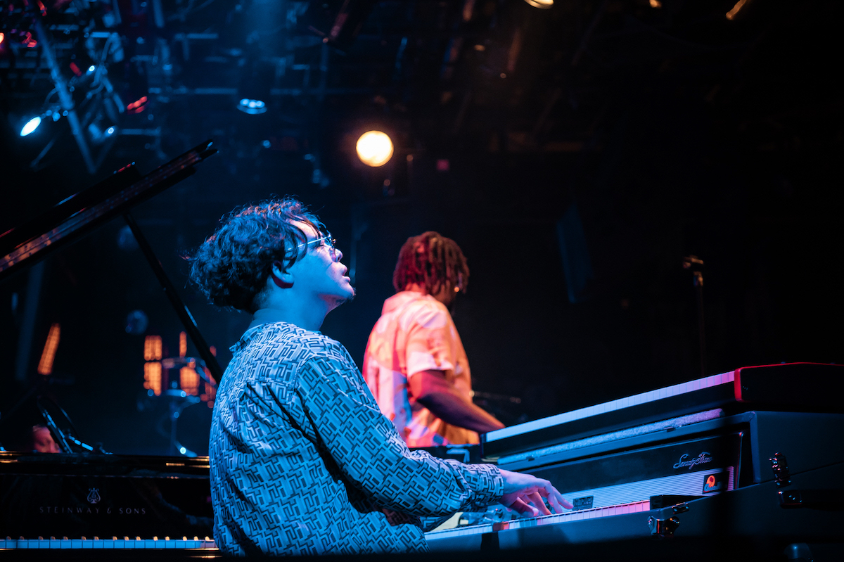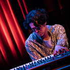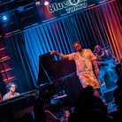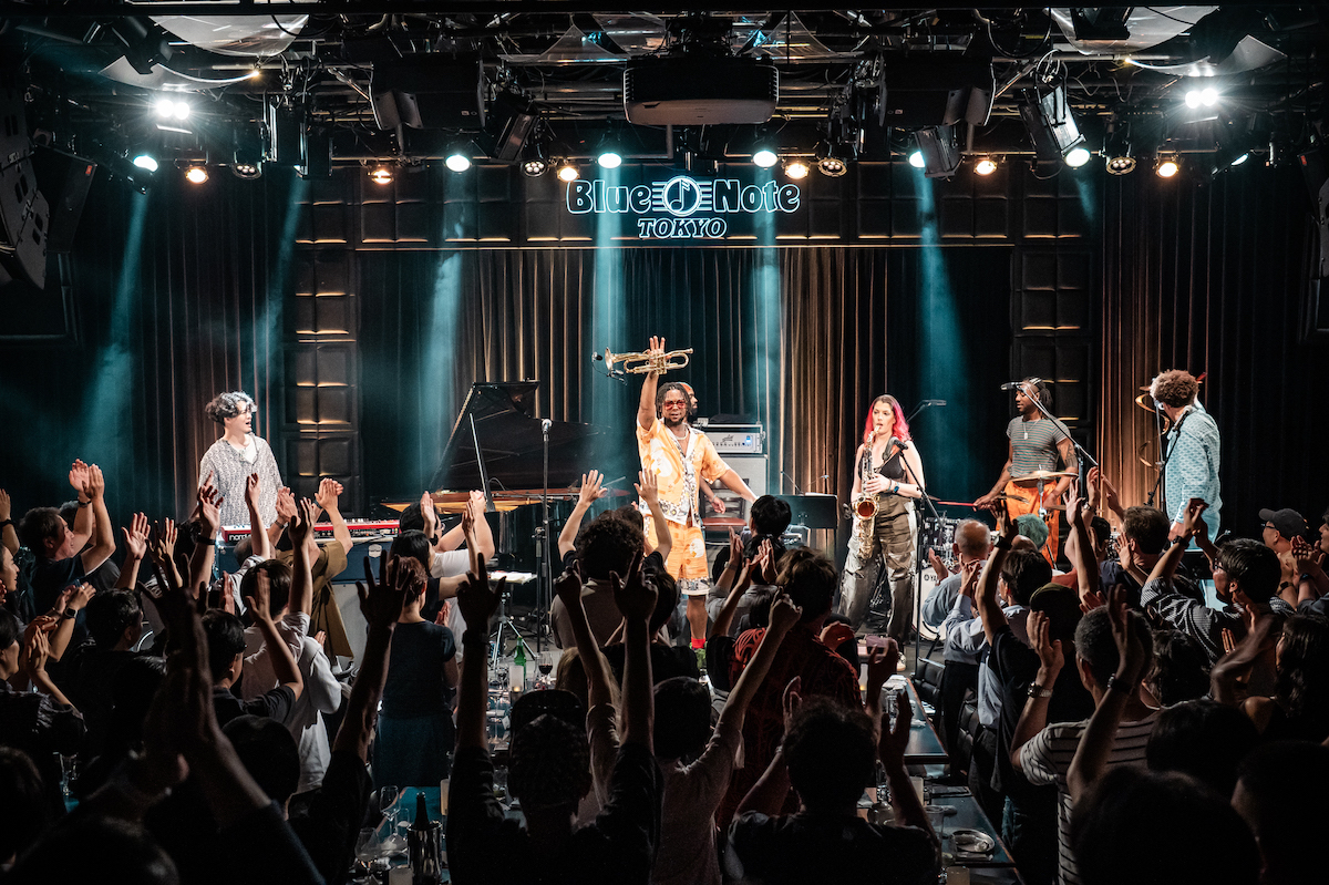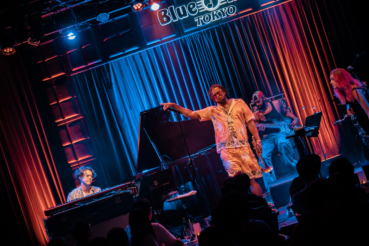 演奏曲目はアルバム『The Mood』からのタイトル曲、「On My Way Home」、「Moroccan Dancehall」、約100年前に誕生したデューク・エリントンの古典的楽曲にアップ・トゥ・デイトなアレンジを加えた「In a Sentimental Mood」等。ブラウンは独特の形状のマウスパイプを持つ愛用のトランペットから輝かしい音色を、ときにミュートやエフェクターの効果を伴って届けるとともに、ラップや歌も披露、バンド・メンバーにも細かな指示を与え、実にファンキーでありながら緊張感も失わない音作りでオーディエンスを惹きつけます。一度聴いたら忘れられないメロディとリズム・パターンを持つ「Moroccan Dancehall」も、ライヴになるとさらに迫力倍増といったところ。ステージのあらゆるところに目線を送り、トランペットのベルを向け、演奏しないときにもダンスしたり、トランペットをバットのように持って球を打つようなポーズをするブラウンは、卓越した奏者であるとともに、魅力的なエンターテイナーでもあります。"ジ・エンプレス"の一員でもあるチェルシー・バラッツはテナー・サックスに専念してブラウンと良きアンサンブルをつくり、フェンダー・ローズとアコースティック・ピアノでめくるめくアドリブを展開した泉川貴広、バンドにロック・テイストを持ち込むギタリストのブランドン・タズ・ニードラウアーの演奏も見事でした。