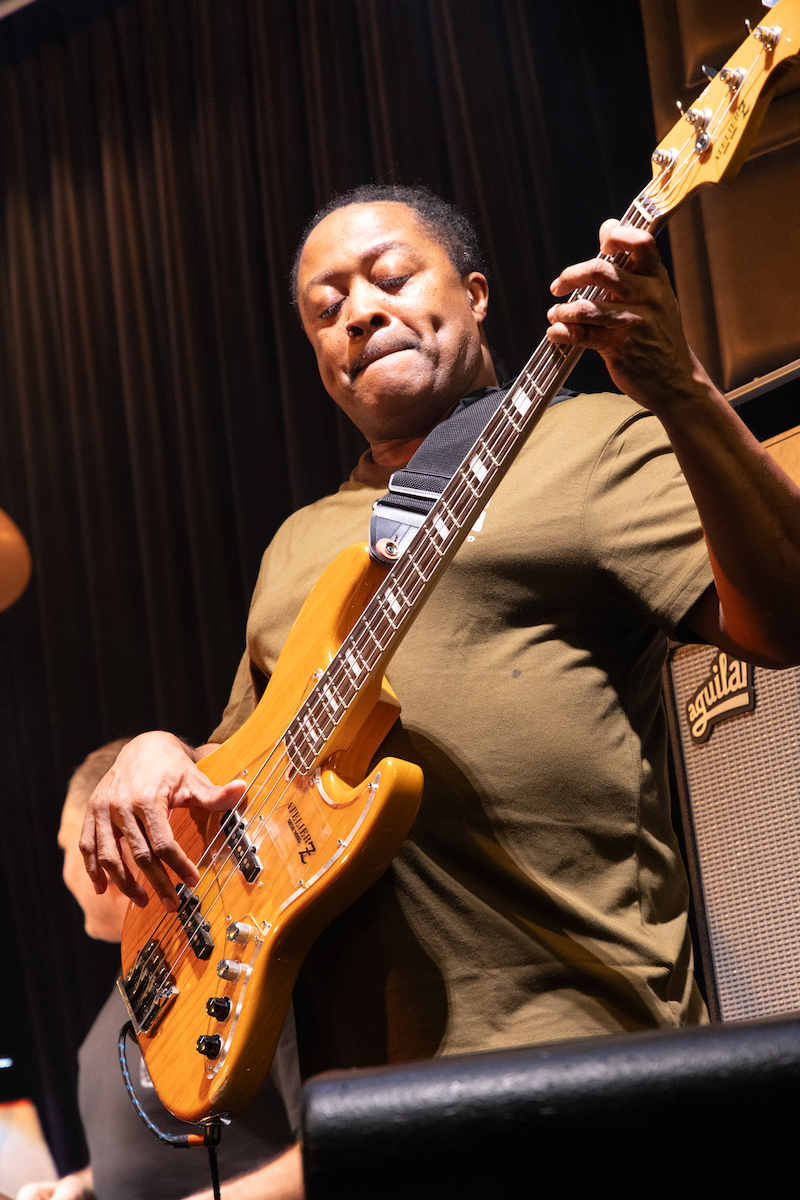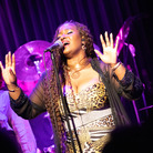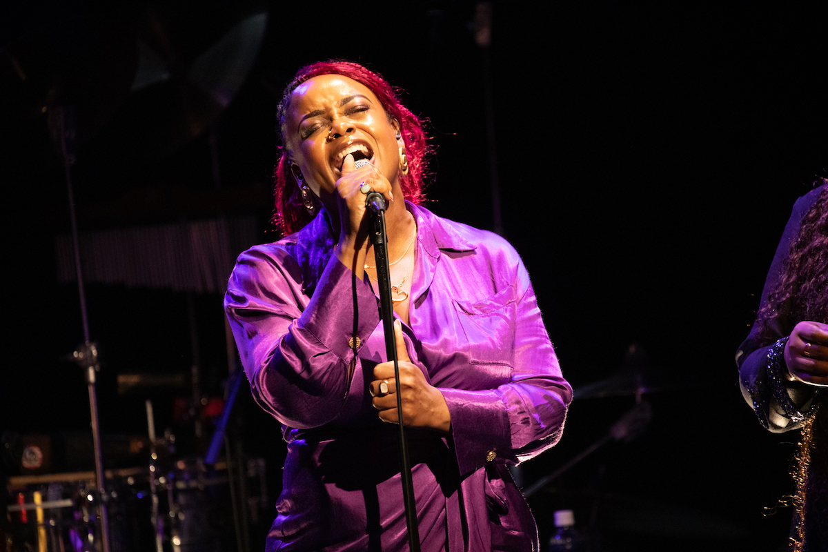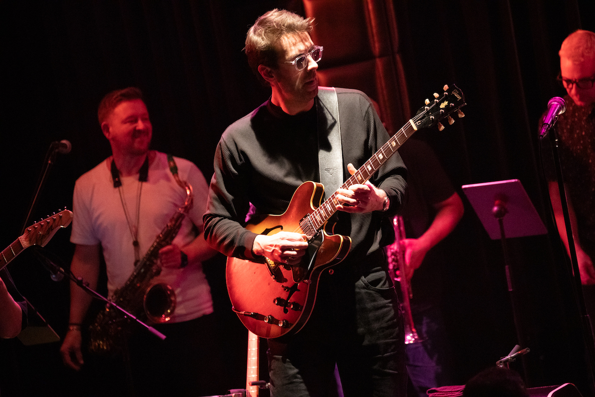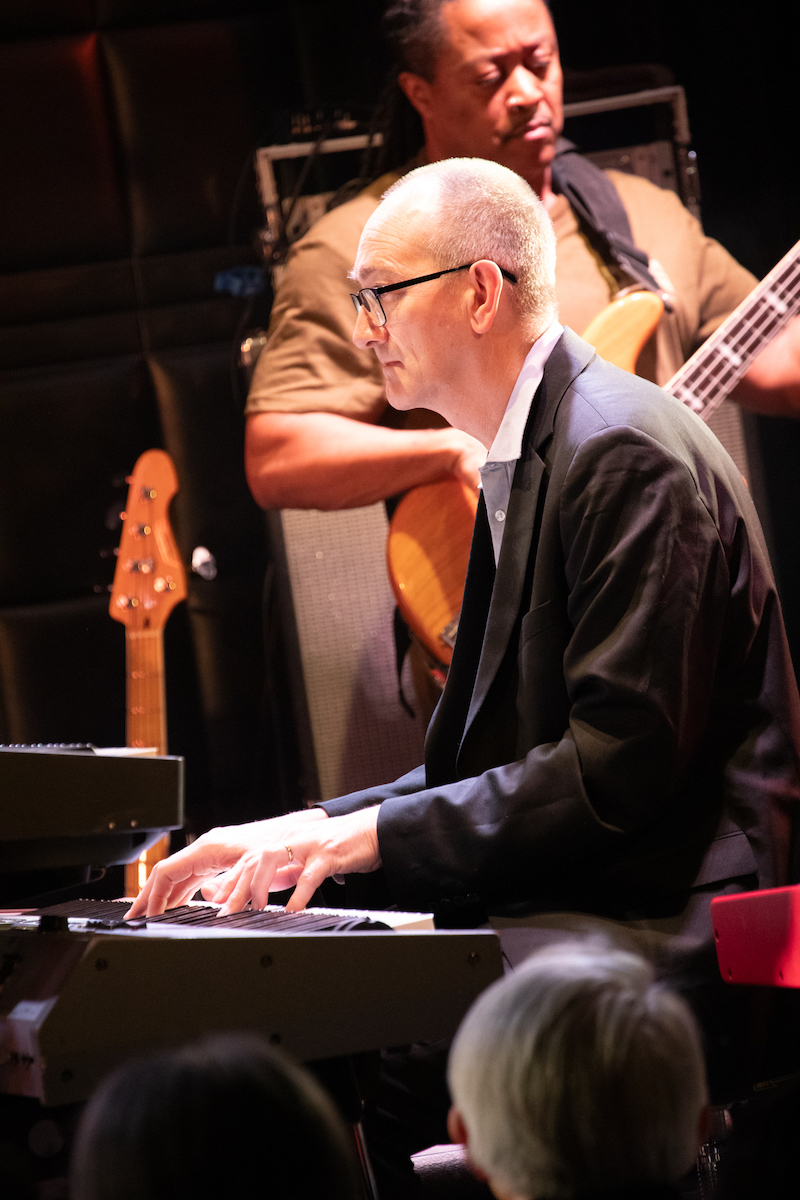 前半では『Music. Magic. Ironic.』の収録曲が次々と、目の前で披露されました。オープニングの「Running Away」は、昨年亡くなったロイ・エアーズが1970年代に発表した代表曲。インコグニートは彼の訃報に接する前にレコーディングを済ませていたとのことです。ロイ自身のヴァージョンも「かっこいい」の一言に尽きますが、インコグニートはこれを4人のヴォーカリストをフィーチャーしたアレンジで届けます。歌い手たちはチェリー・V、クレオ・レイン・スチュワート、トニー・モムレルに、"ポスト・エイミー・ワインハウスの最右翼"と紹介されたこともあるナタリー・ダンカン。ソロで歌ってもハモリを入れてもトップ・クラスの面々が並び、さらに今回は気鋭のキッコ・アロッタと大ベテランのグラハム・ハーヴィーのツイン・キーボードも楽しむことができます。ステージに並ぶのは、総勢14人。これまでの最大規模といっていいアンサンブルが、創設者/ギタリスト/プロデューサーであるブルーイの指令によって炸裂するのです。