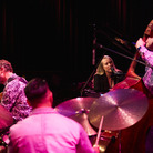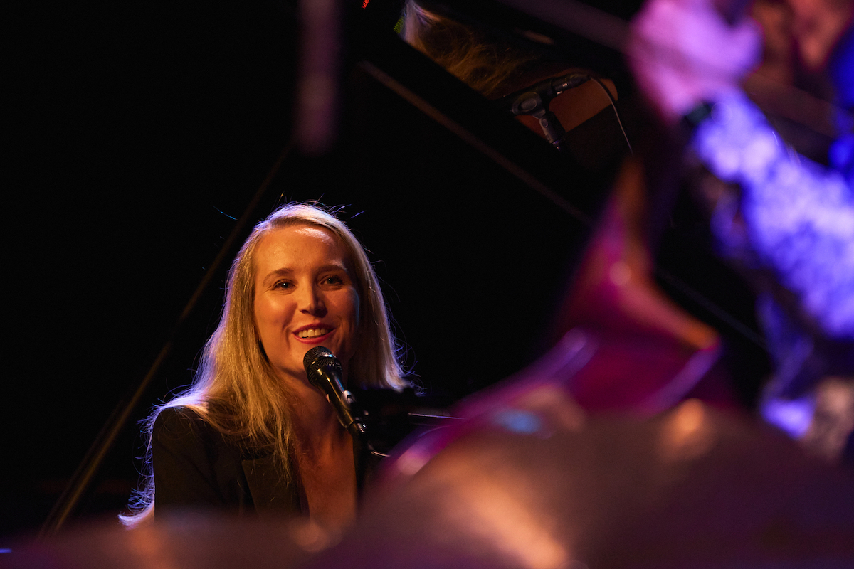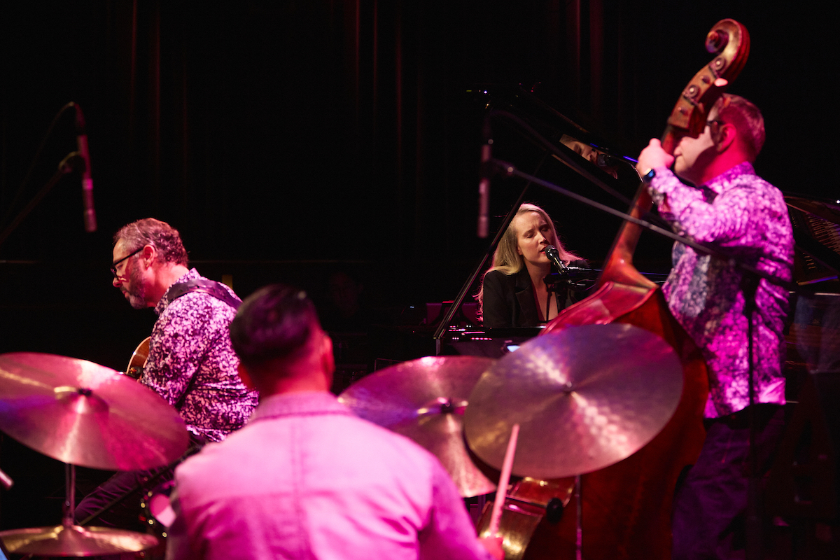 名手が揃っているだけに、各人のソロも存分に聴いてみたいと思うのはリスナーとして当然の思いでしょう。果たしてオープニングは、インストゥルメンタル曲「L.A. Police Pursuit」でした。高速のユニゾンで奏でられるテーマ・メロディに続いて、それぞれのアドリブがフィーチャーされます。どこか「Moanin'」を思わせるファンキーな曲調を持つこの曲で4人の一体感を示したあとは、サラの出世作と言える「Paris In The Rain」をしっとりと。続いてミシェル・ルグランに敬意を示したオリジナル曲「Secrets of My Heart」、ジャキス・モレレンバウムなどブラジルのミュージシャンも参加した近作『Without You』からはアントニオ・カルロス・ジョビンの書いた「Dindi/Modinha」を聴かせてくれました。"ブラジルの音楽にはメランコリーとジョイフルなところが共存していて、私はそこが大好きなんです"というサラのMCに共感したオーディエンスも多かったのではないでしょうか。