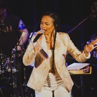 ステージではまずサポート・メンバーが位置につき(エリック・ミヤシロは東京と高崎公演に参加)、快調な演奏を開始します。そして、少しあとに聴こえてきたのがベースのアンドリュー・レヴィのスラップ奏法、ギターのサイモン・バーソロミューの強烈なコード・カッティングです。通路を歩きながら演奏していた彼らがバンドスタンドにあがると、さらに大きな拍手と歓声が沸きます。が、これでザ・ブラン・ニュー・ヘヴィーズが"完全体"というわけではありません。真っ白なコスチュームで最後に登場したのはグループの歌姫、アンジェラ・リッチ。彼女の熱唱が、本格的なパーティ・タイムの到来を告げます。