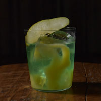 オレンジやハーブリキュールを主体に金木犀香る紅茶とトニックウォーターで爽やかに仕上げ、洋梨のピューレを浮かべた一杯。