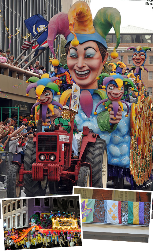 仮面舞踏会など町中のいろいろな場所でパーティーが催されますが、一番醍醐味あふれるのは、車道を大型のフロート(日本の祭りで言う山車(だし))が進むパレード。フロートからは仮装した人たちが観衆に向かってマルディグラ色(紫緑金色)のビーズやお菓子を投げ、観衆もそれらを貰おうと派手な格好をしアピールします。