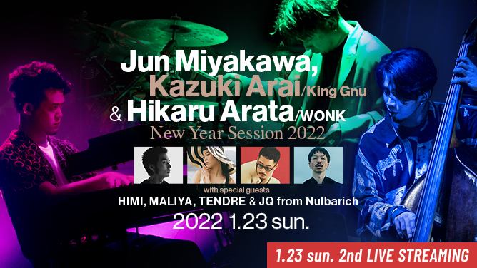 前回、大反響を巻き起こした“新年会トリオ”こと宮川純、新井和輝(King Gnu)、荒田洸(WONK)による"New Year Session"が新春のブルーノート東京を飾る。NAO YOSHIOKAや黒田卓也aTakなど引く手あまたのマルチ鍵盤奏者、宮川純。いまや時代を代表するトップ・バンドへと成長したKing Gnuのベーシスト、新井和輝。先日のブルーノート東京公演でも抜群の存在感を示したエクスペリメンタル・ソウルバンド、WONKのリーダーも担うドラマーの荒田洸。それぞれがシーン最前線で活躍しながら、“ジャズ”を共通言語に持つ3人の豪華な顔合わせがふたたび実現。ミレニアル世代の俊英による非凡なテクニックと才気に満ちたサウンドが共鳴し合う予測不能なセッション、サプライズ・ゲストにも期待が高まる見逃せないステージだ。